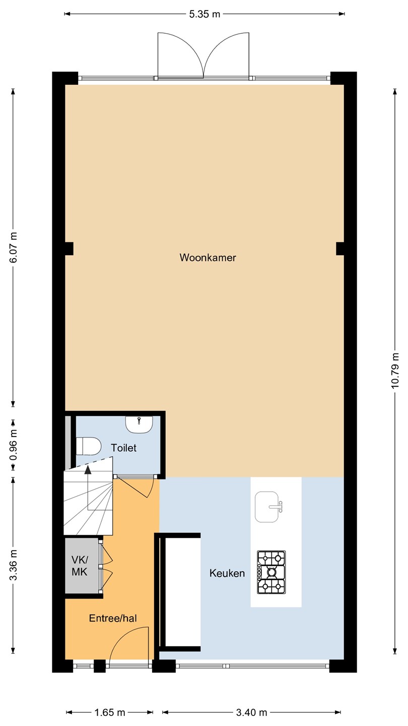 De zonnige grote voortuin leidt naar de voordeur. In het entree bevindt zich een ingebouwde garderobekast, meterkast, trapopgang naar boven en een fraai toilet met fonteintje. Vanuit deze hal wordt via een moderne glazen deur met zwart staal de lichte uitgebouwde woonkamer bereikt. Hier ligt een uiterst fraaie massief houten planken vloer, strak gestucte muren en dito plafonds. Het sfeervolle zitgedeelte is georiënteerd op de achtertuin en voorzien van openslaande deuren. Ook voorzien van speelse details zoals strakke nisjes voor decoratie.
