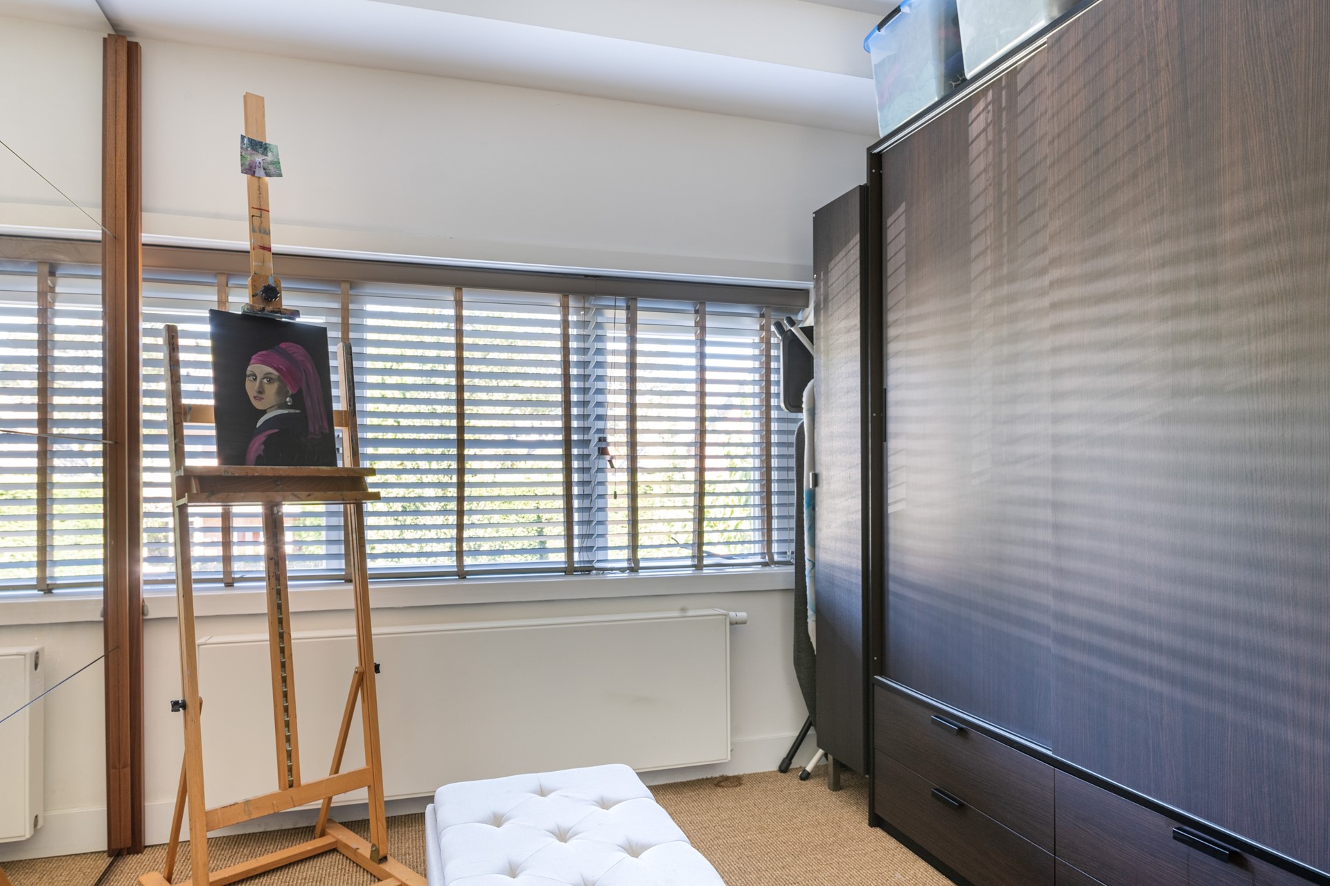 Via de trapopgang in de hal wordt de 1ste verdieping bereikt. De overloop biedt toegang tot 3 slaapkamers en de badkamer. Aan de achterzijde van de woning bevinden zich de master-bedroom en een kleine slaapkamer (momenteel in gebruik als werkkamer), en aan de voorzijde bevinden zich een slaapkamer en de badkamer. De badkamer is licht en speels door de balken en de toilet-nis, verder een inloopdouche en wastafel en voldoende ruimte voor een kast voor het opbergen van bijvoorbeeld toiletartikelen en handdoeken. Net als in het toilet beneden is hier gebruik gemaakt van exclusief tegelwerk en strak gestucte wanden.