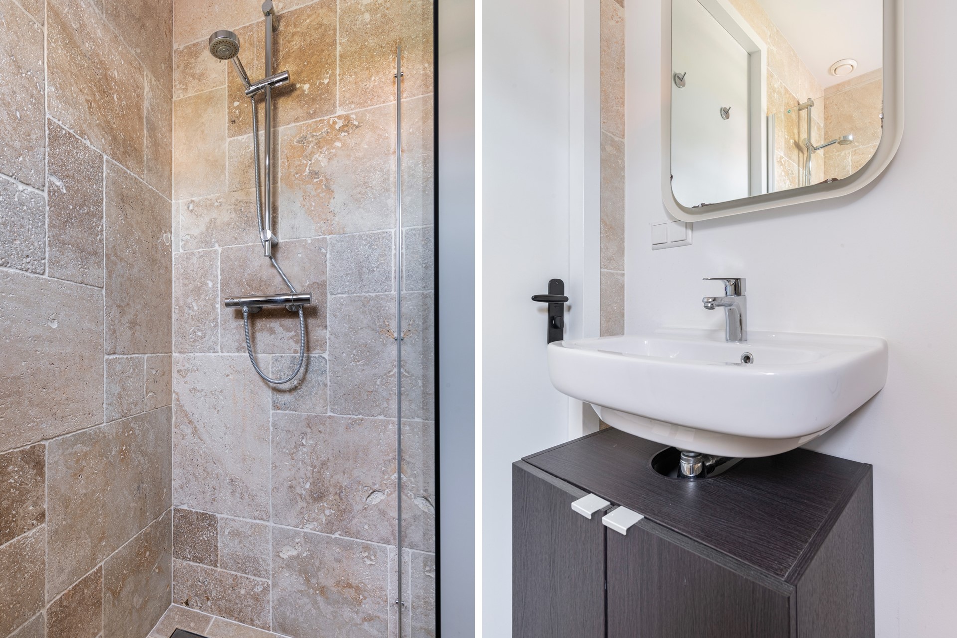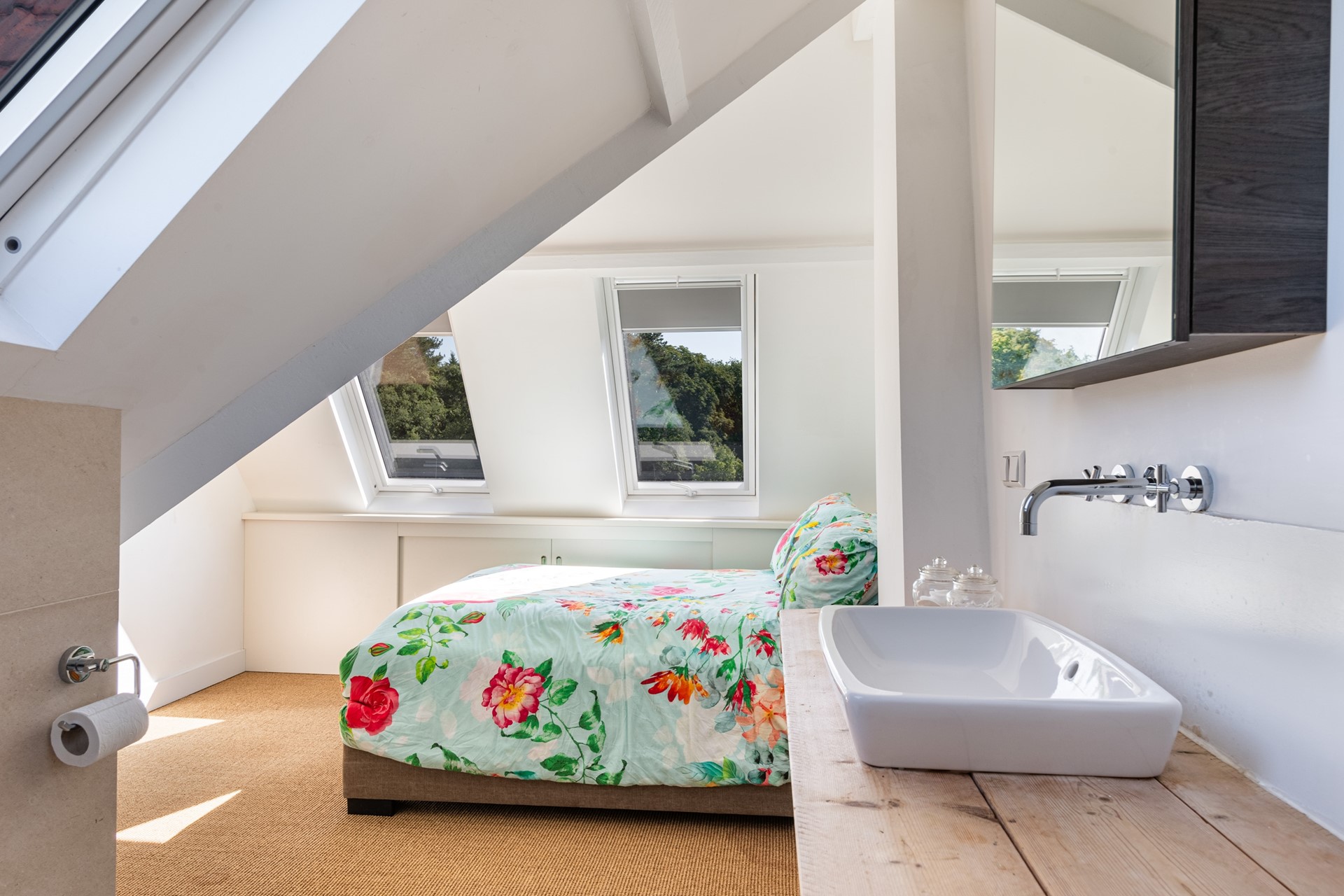 Lichte overloop (door een Velux dakraam) en deze biedt toegang tot de wasruimte met opbergruimte, waar ook de cv-ketel is gesitueerd. Het betreft een Remeha CV-ketel van 2011. Verder op deze verdieping een riante slaapkamer met badkamer "ensuite". Op deze kamer is er lichtinval van beide kanten door meerdere Velux-ramen (drie stuks). De badkamer is voorzien van een ligbad, hangend toilet en wastafelmeubel. Ook hier is het bad weer in een knusse nis geplaatst wat het geheel erg mooi maakt. Het tegelwerk, de gestucte wand- en plafondafwerking en de "sisal" vloerafwerking is ook op deze verdieping consequent doorgevoerd.