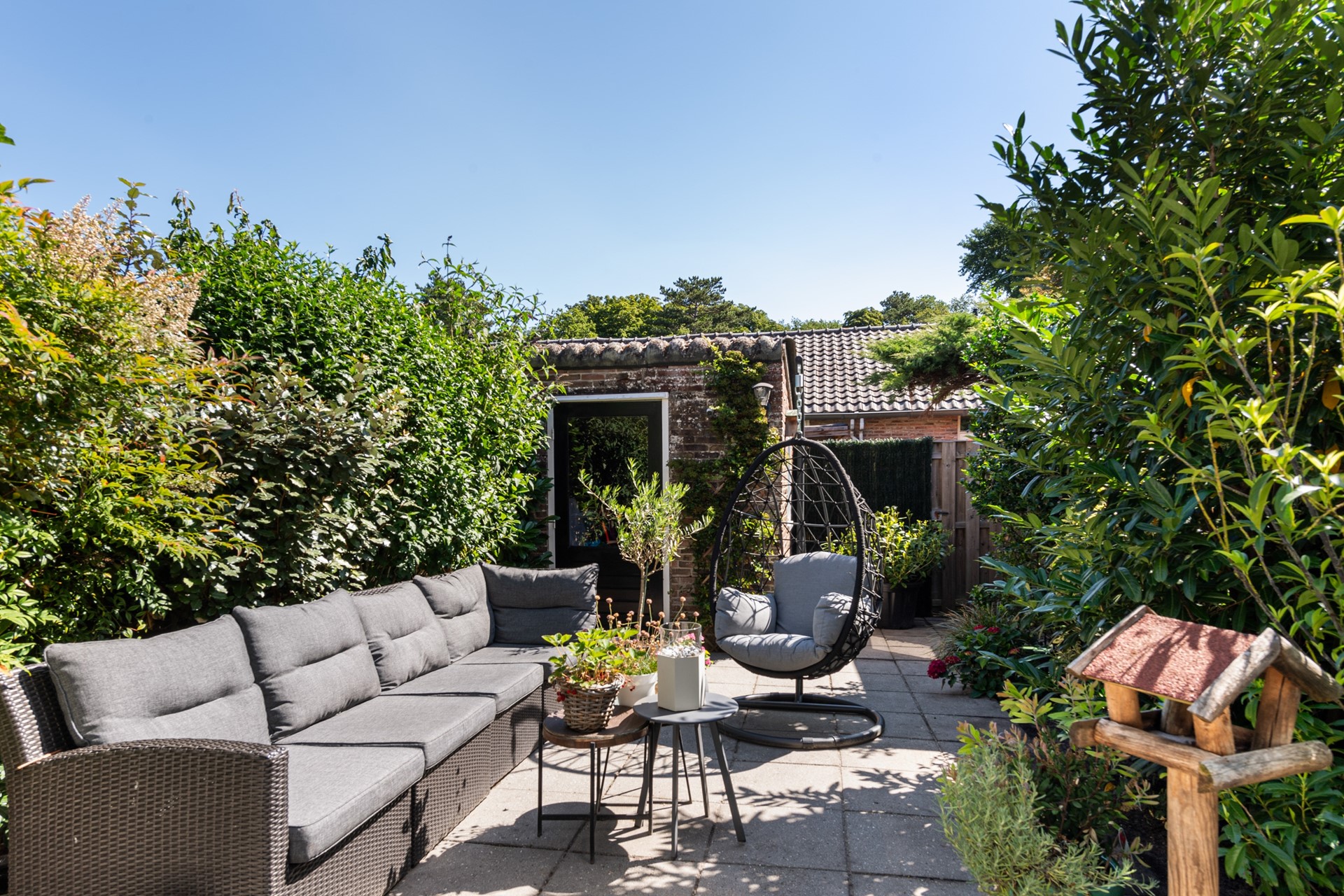 - Tuingerichte woon-, leef- en eetkamer met openslaande deuren