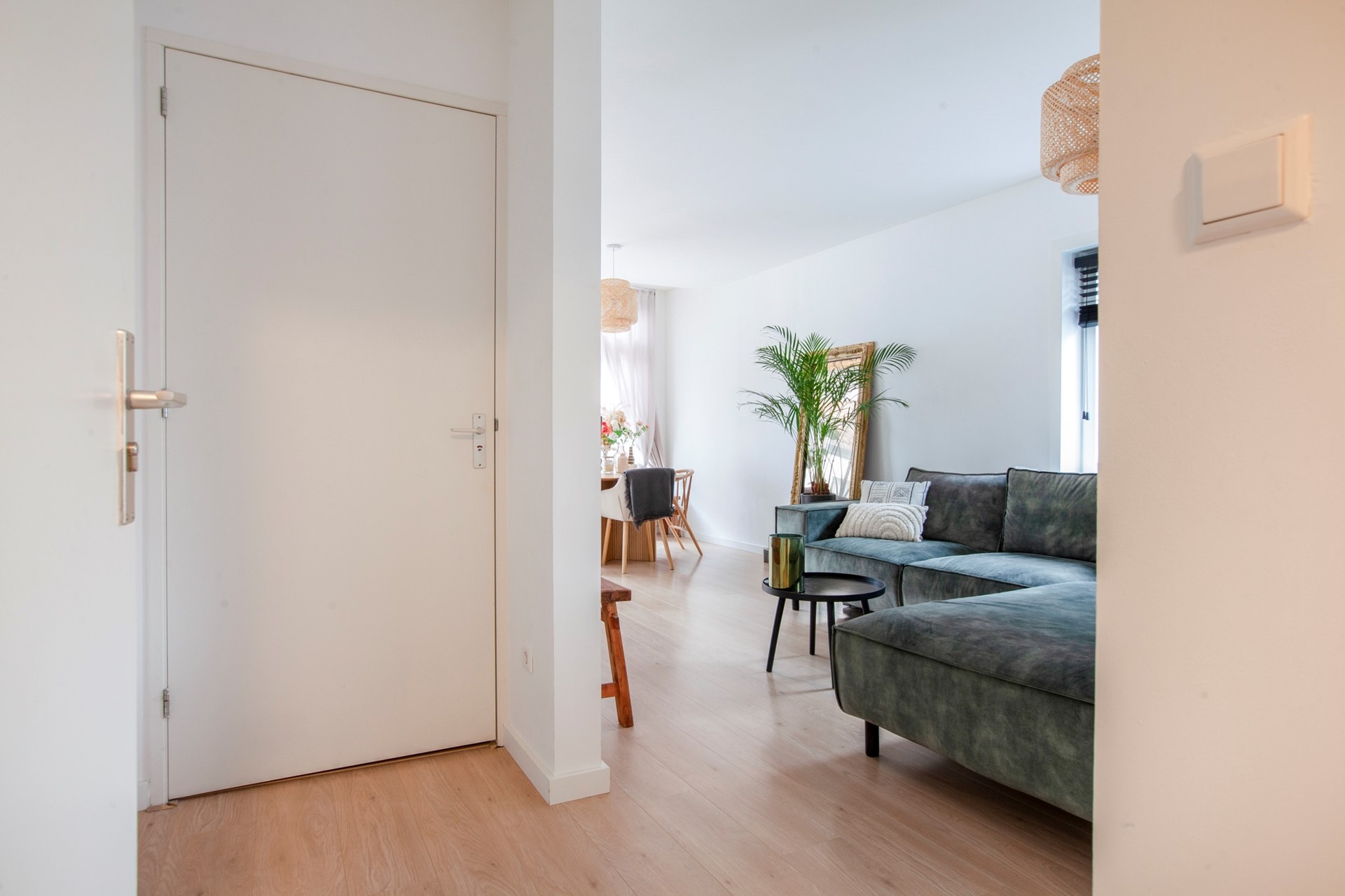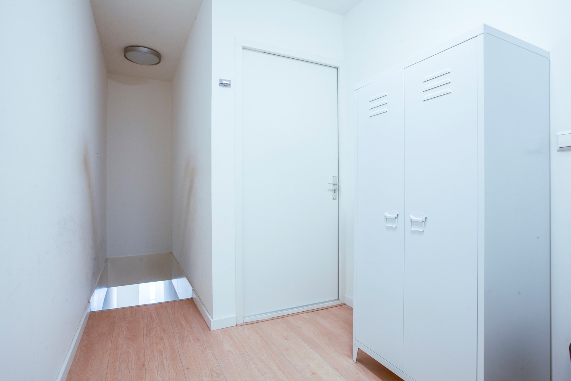 Afgesloten entree met brievenbussen en trapopgang naar een ruime overloop op de eerste etage. Hier bevindt zich de entree van het appartement.