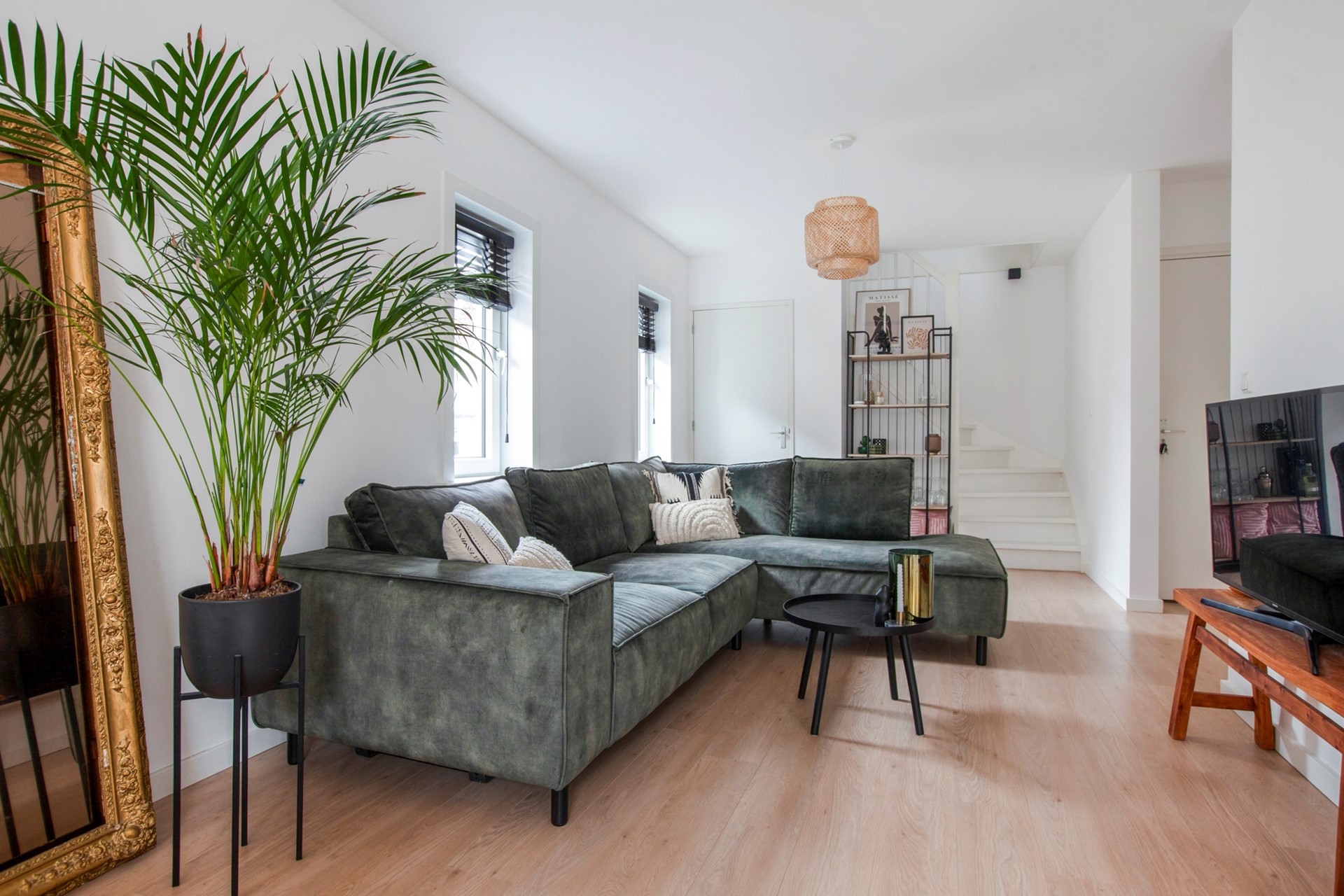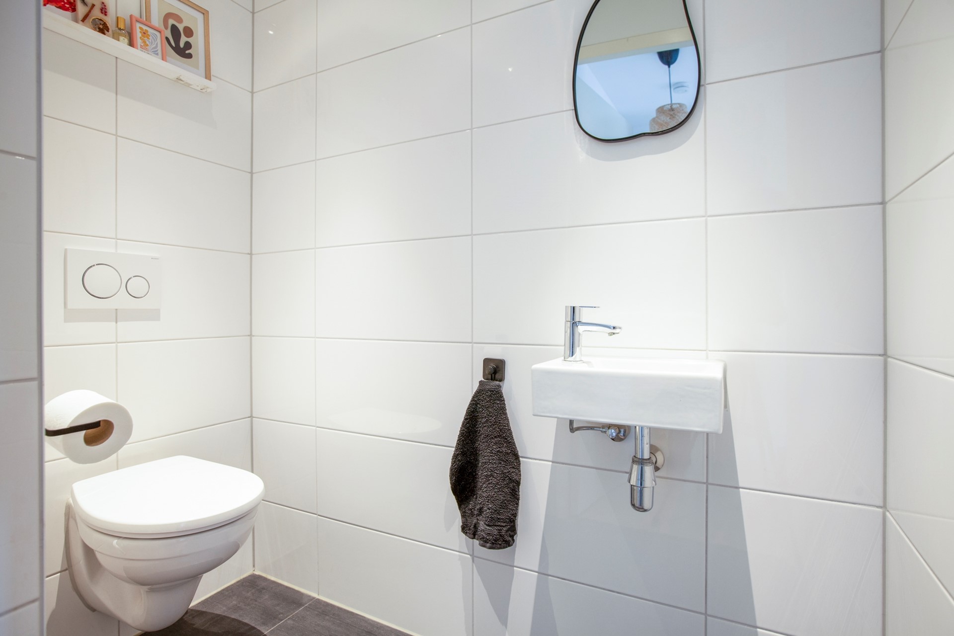 Via de open hal betreedt u direct de ruime, lichte woonkamer met een speelse erker en een moderne open keuken. Aan de voorzijde bevindt zich het eetgedeelte met een nette hoekkeuken, uitgerust met een 4-pits gaskookplaat, afzuigkap, oven, vaatwasser en koel-vriescombinatie. Het zitgedeelte ligt centraal in de ruimte. Aan de achterzijde vindt u de open trap naar de tweede verdieping en een ruime berging met daglicht. Bij de entree bevindt zich tevens een keurig afgewerkte toiletruimte met hangend closet en fonteintje. De wanden en plafonds zijn strak gestuct en de vloer is afgewerkt met een lichte laminaatvloer in houtlook met V-groef.
