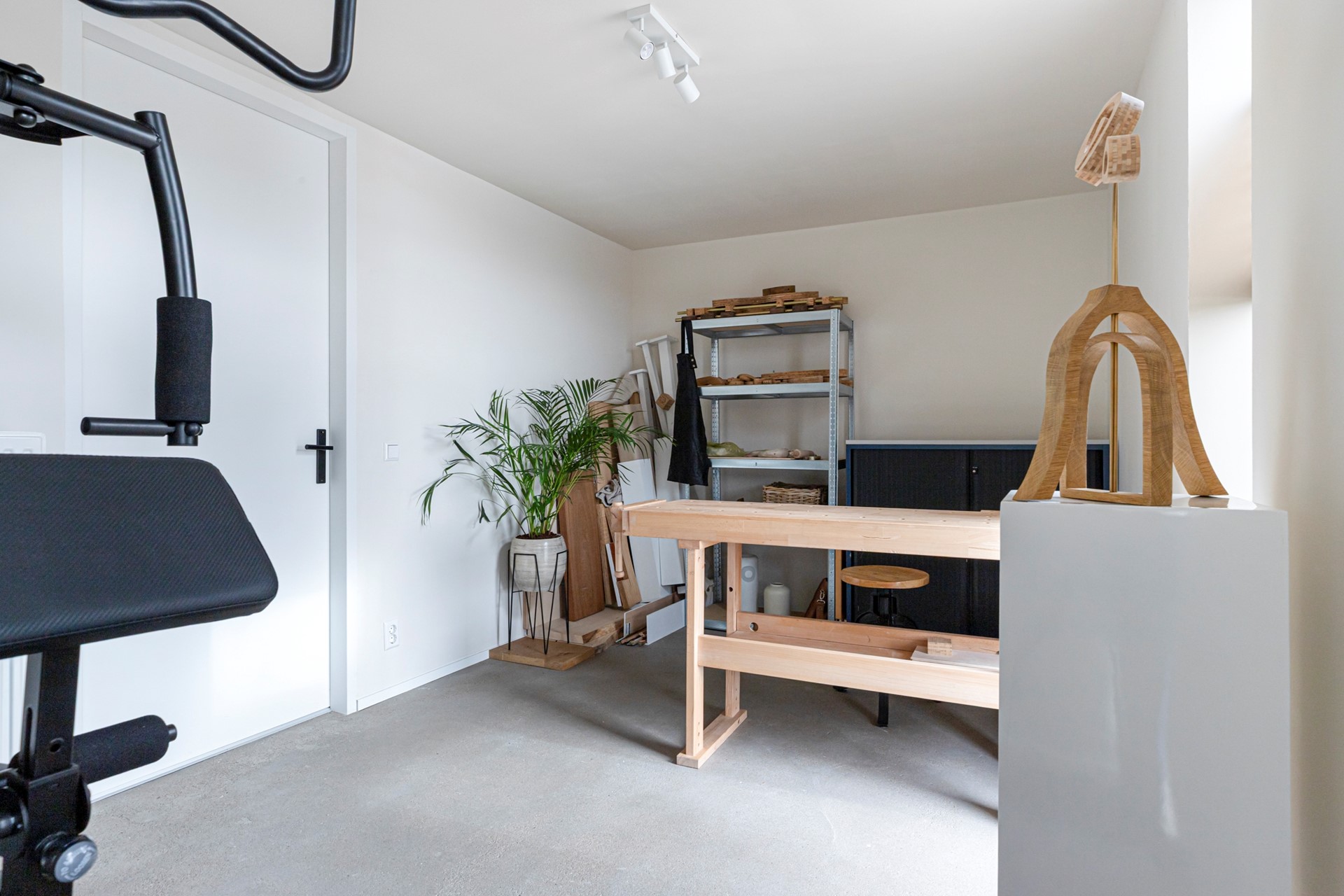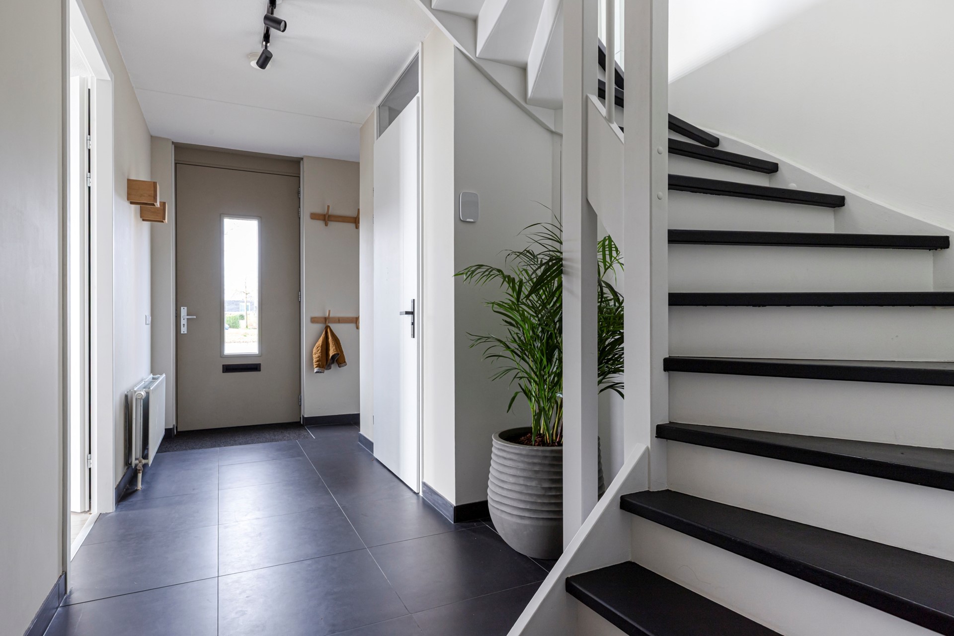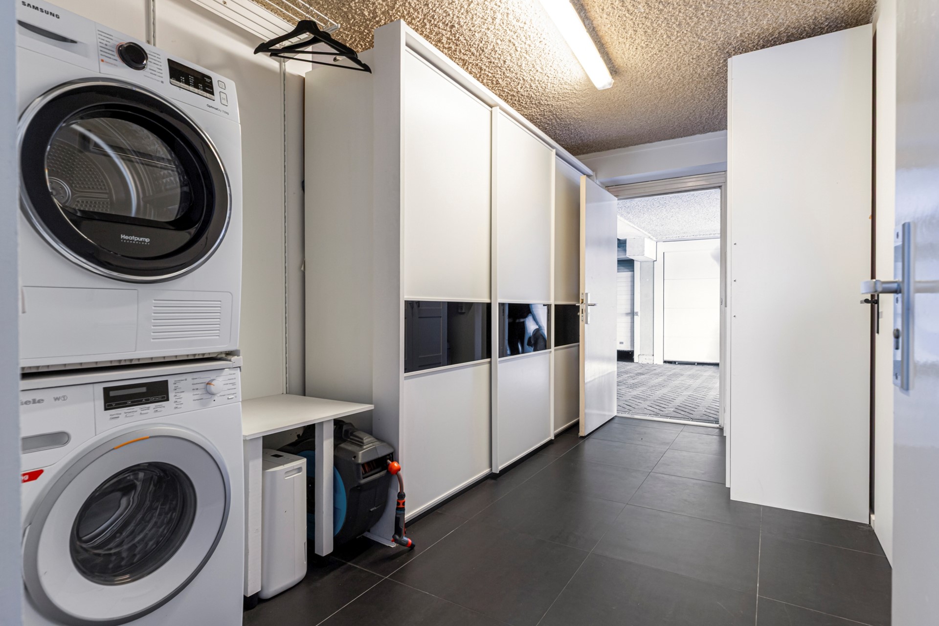 Bij binnenkomst de ruime entree met garderobe, die toegang geeft tot een toiletruimte, twee kamers en een riante bijkeuken/wasruimte. De eerste kamer doet dienst als kantoor; de tweede wordt gebruikt als hobby- en sportkamer. De bijkeuken/wasruimte heeft aansluitingen voor wasmachine en droger en beschikt over veel bergruimte dankzij een kastenwand. Een deur vanuit deze ruimte leidt naar de parkeergarage met een dubbele garagebox voorzien van een elektrische garagedeur en loopdeur. Vanuit de entree wordt via de trap de woonverdieping bereikt. De vloer bestaat deels uit antracietgrijze tegels en deels uit laminaat. De wandafwerking is strak gestuct en het plafond is gespoten.