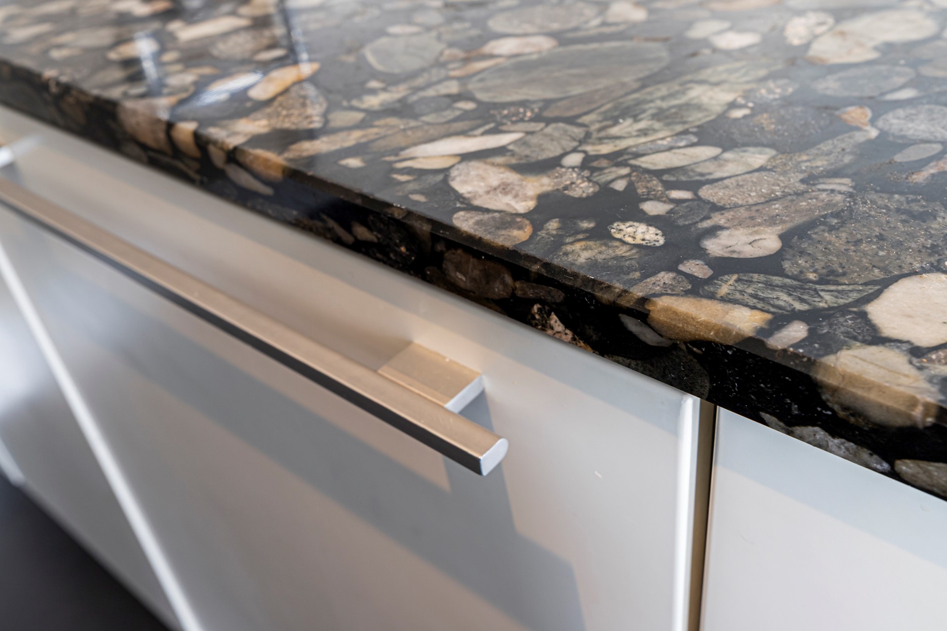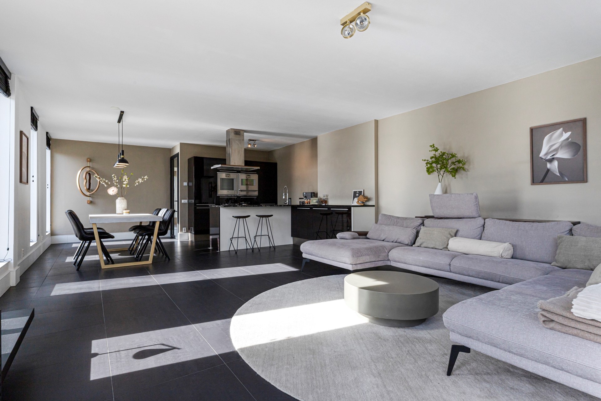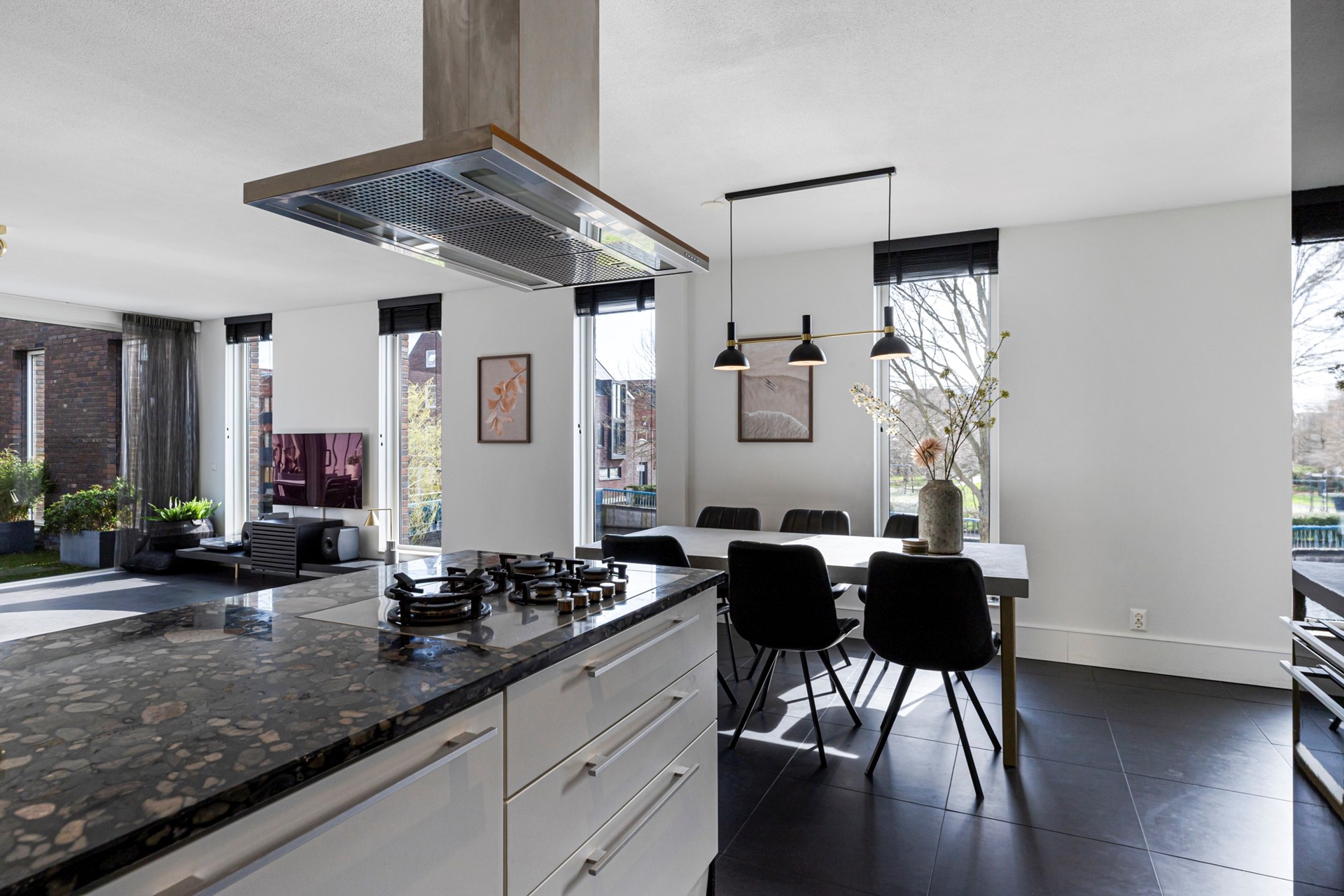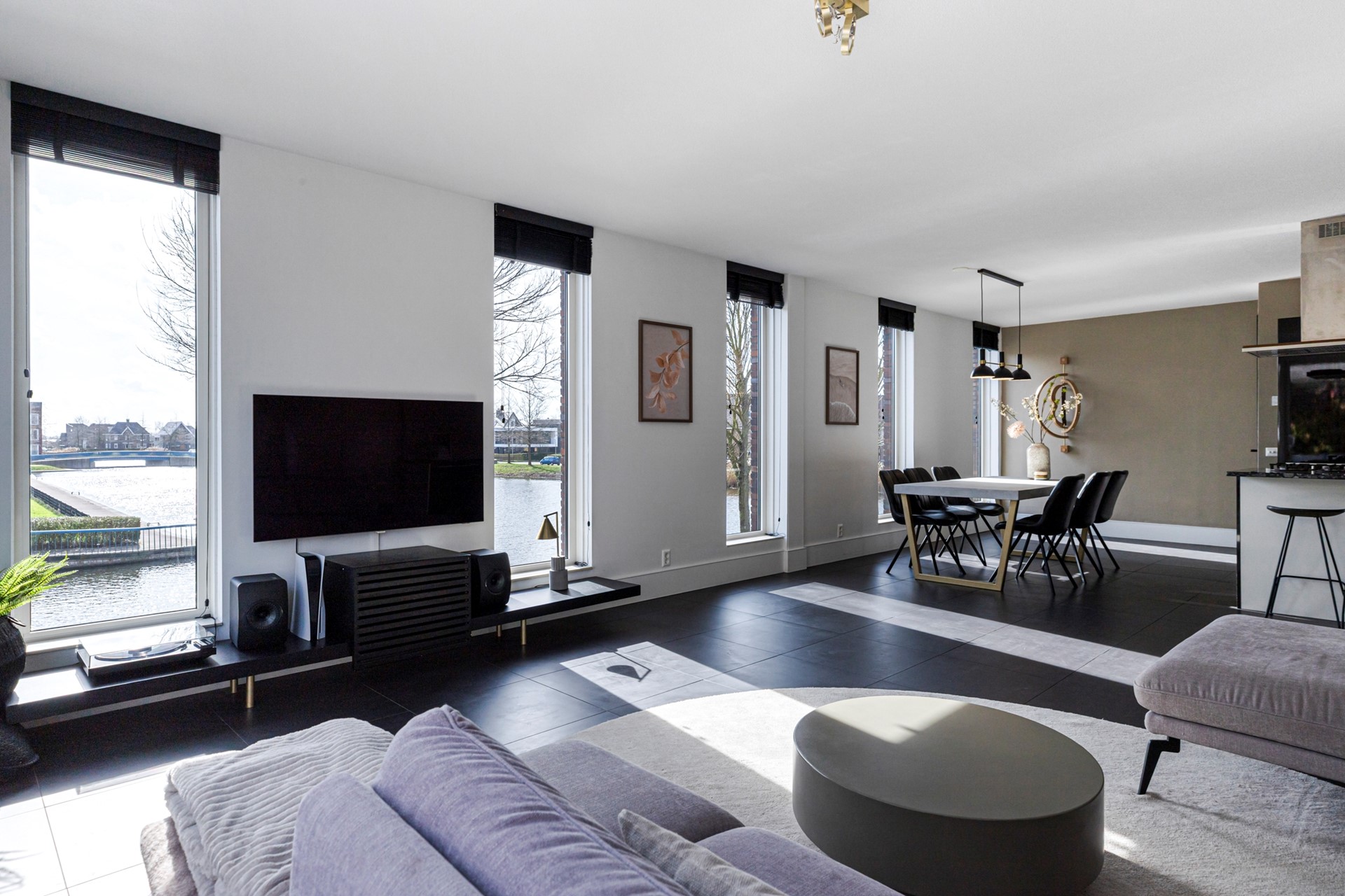 Hier bevindt zich de overloop, die toegang biedt tot het toilet, de woonkamer met keuken aan de achterzijde, een badkamer en twee kleinere slaapkamers aan de voorzijde. Via een moderne zwarte deur met glas wordt de royale woonkamer bereikt, die dankzij de grote ramen bijzonder licht is en een fraai uitzicht biedt op het groen en het water – letterlijk levende schilderijen die met de seizoenen veranderen. De zithoek bevindt zich aan de achterkant en grenst aan de tuin, terwijl het eetgedeelte naast de keuken is gesitueerd. De moderne keuken met schiereiland is volledig uitgerust met inbouwapparatuur: een vijfpits-gasfornuis met afzuigkap, koelkast, vaatwasser, stoomoven, oven, warmhoud-lade en een natuurstenen aanrechtblad. De vloer is hier voorzien van antracietgrijze tegels met vloerverwarming, glad gestucte wanden en een gespoten plafond.