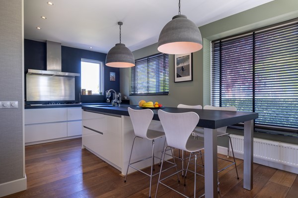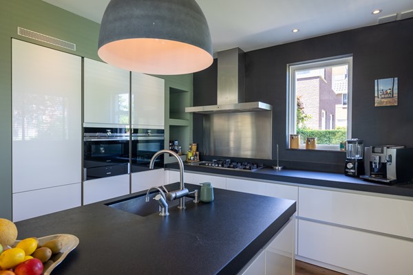 Vanuit de woonkamer is de ruime aan de voorzijde gelegen keuken bereikbaar. De keuken is modern en goed geoutilleerd met o.a. een 5-pits gasfornuis met teppanyaki-plaat, afzuigkap, oven, combimagnetron, vaatwasser, koel/vries-combinatie, quooker en een riant kookeiland voorzien van spoelbak (de oven, combi magnetron en vaatwasser zijn vernieuwd in 2021). Het eiland en het aanrecht zijn voorzien van een mooi natuurstenen blad. Ook biedt dit eiland een mooi uitzicht op de voortuin. De grote raampartijen in de keuken zijn voorzien van diepe vensterbanken, waarin heerlijk gezeten kan worden. Een sfeervolle plek om met een kop thee of een glas wijn in alle rust te genieten van de mooie tuin.