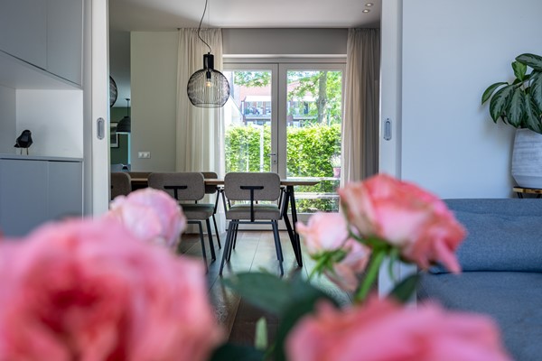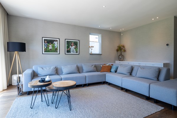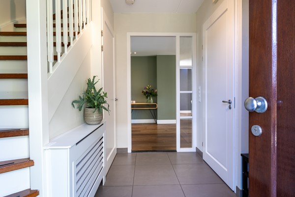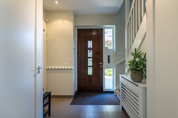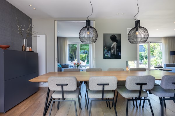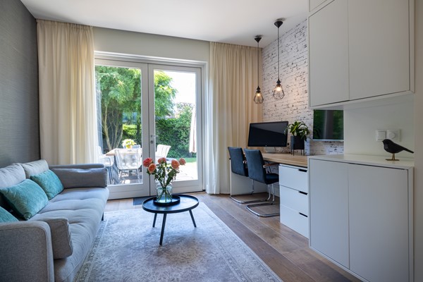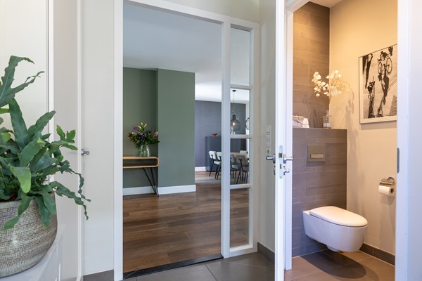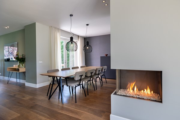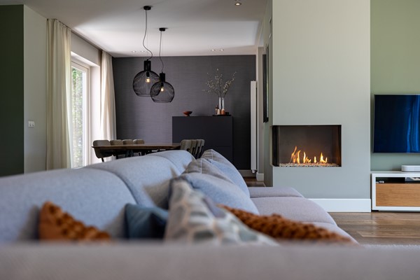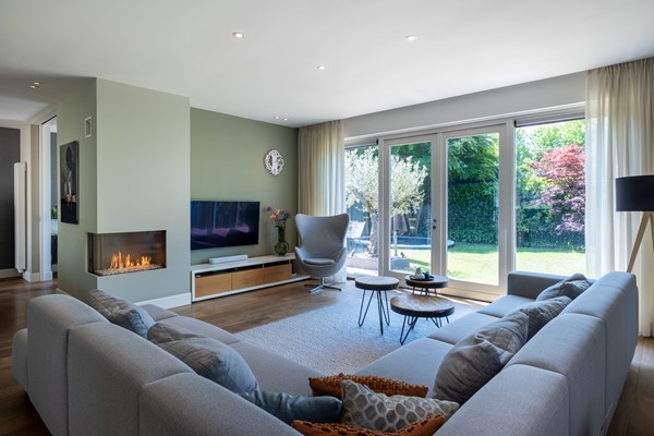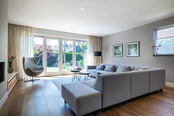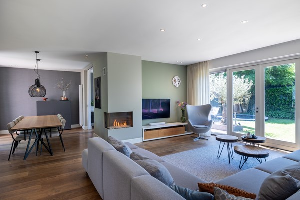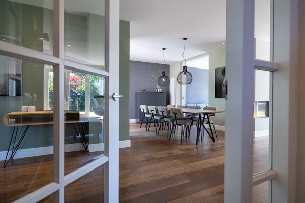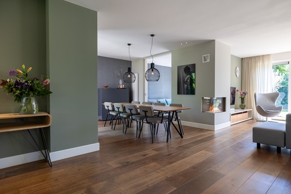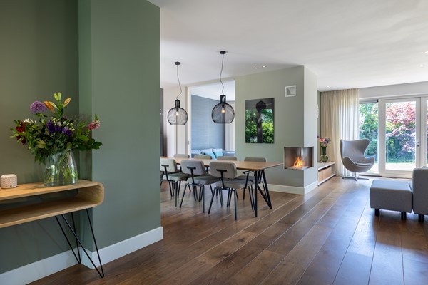 Het ruim en licht entree, met garderobe, meterkast, keurig toilet met fontein, biedt tevens toegang tot de kelder. Via een fraaie deur met zijraam (hout met glas) wordt de lichte en riante woonkamer bereikt. De woonkamer is voorzien van een verlaagd plafond met inbouwspots, grote raampartijen, een gezellige gashaard en is gesitueerd aan de achterzijde van de woning. Vanaf hier is er een prachtig zicht over de tuin. Halverwege de lengte zijde van de woning bevindt zich een ruime eetgelegenheid met openslaande deuren richting het aan de voorzijde gelegen terras. Qua vloerafwerking is in de woonkamer gekozen voor een massief ‘eiken’ houten plankenvloer (2016). De wand- en de plafond afwerking is voorzien van glad stucwerk.