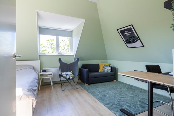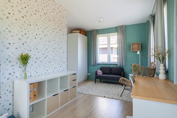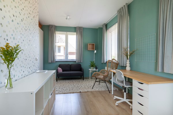 Op deze etage is de wand afgewerkt met glasvlies-behang (met licht reliëf) en voor de vloerafwerking op deze verdieping is gekozen voor lichte PCV-vloer in hout-look en deze is drempelloos doorgelegd.