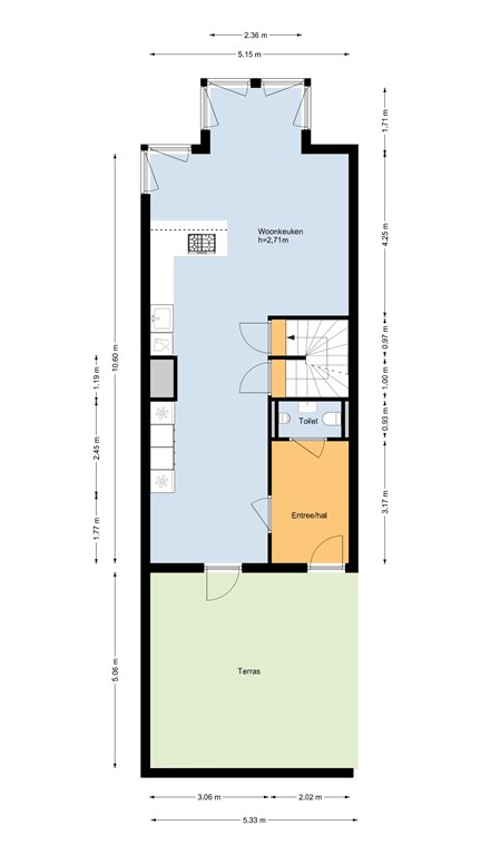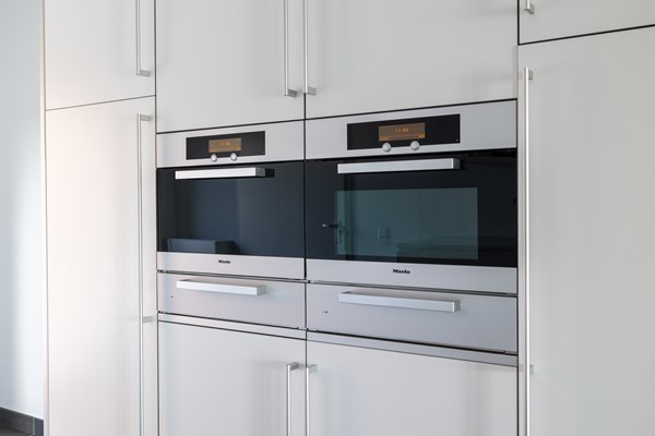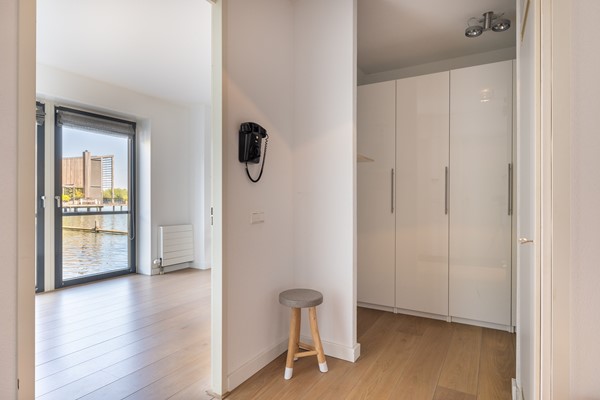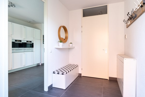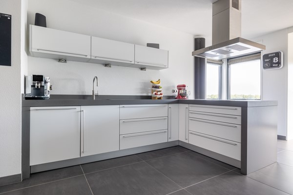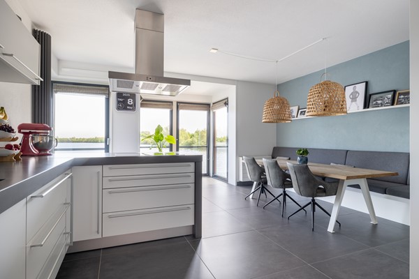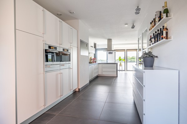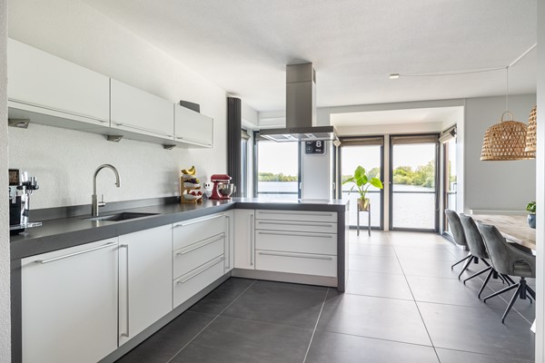 Op deze woonlaag bevindt zich de voordeur die bereikbaar is via het privéterras, gelegen aan de rand van de wandelpromenade. Via de voordeur wordt de hal bereikt met hier een ruime toiletruimte met zwevend closet, urinoir en fonteintje. Via de hal wordt de riante woonkeuken bereikt met een moderne en goed geoutilleerde keukenopstelling. Deze Bulthaup keuken heeft onder andere een grote koelkast en aparte grote vriezer, stoomoven, warmhoudlades, oven/magnetron combi, keramische kookplaat, vaatwasser, quooker en afzuigkap (Betreft Miele apparatuur, muv ATAG vriezer). De keuken is uitgevoerd in mat wit met een robuust grijs composiete blad. Aan de achterzijde is een fraaie eethoek gesitueerd met zicht op de plas. De woonkeuken is erg licht door de hoge raampartijen in de woning en de "speelse erker" aan de achterzijde. Qua vloerafwerking is hier gekozen voor een antraciet grijze tegelvloer met vloerverwarming en de wanden en het plafond zijn voorzien van spuitwerk.