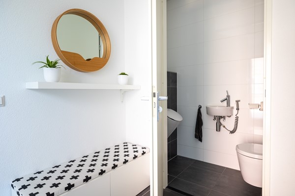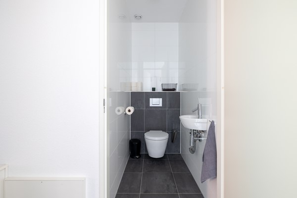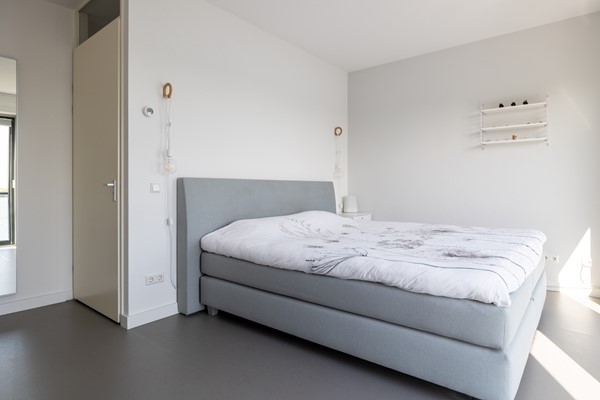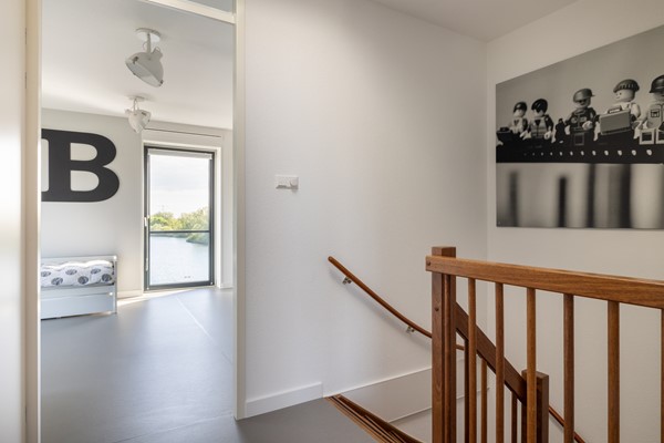 Via de hardhouten open trap in de woonkeuken wordt de eerste verdieping bereikt. De overloop biedt toegang tot drie slaapkamers, de badkamer en een separaat 2e toilet. Aan de achterzijde van de woning bevindt zich een ruime slaapkamer welke uitkijkt over de natuurplas. Aan de voorzijde bevindt zich de 2e slaapkamer welke momenteel in gebruik is als inloopkast. Deze hoog afgewerkte inbouwkast is op maat gemaakt en is voorzien van diverse gemakken zoals een gardarobelift voor de kleding en diverse lades. De 3e slaapkamer is ook aan de voorzijde gelegen. De badkamer is voorzien van een dubbele design wastafel, douchecabine met twee douchekoppen, een ligbad met whirlpool en een designradiator. Qua vloerafwerking is hier gekozen voor een grijze linoleum vloer (doet aan als een gietvloer) en de wanden en het plafond zijn voorzien van spuitwerk.